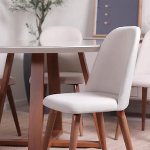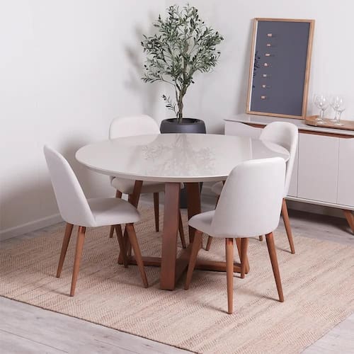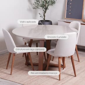 Conjunto de Jantar Mesa Redonda com Vidro Bennett 135 cm 4 Cadeiras New Drop - Natural c/ Bege - Off White