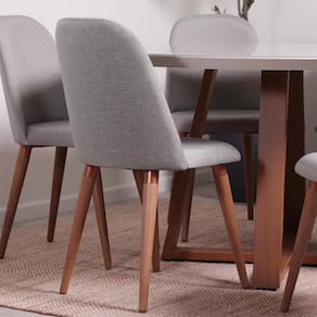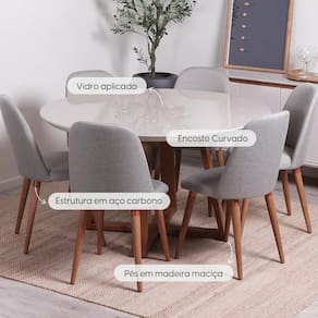 Madeira maciça | MDF | Vidro | Linho | AçoEspecificações: Conjunto composto por 1 Mesa de Jantar e 6 Cadeiras.