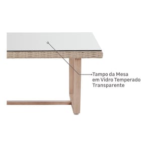 O conjunto e feito de aluminio e rattan, materiais conhecidos pela sua durabilidade e resistencia as condicoes climaticas. A mesa retangular, com dimensoes de 90x70x150, possui um tampo de vidro temperado, proporcionando um toque de elegancia ao conjunto. A banqueta, com dimensoes de 35x50x50cm, e perfeita para acomodar mais convidados ou para descansar os pes apos um longo dia. O sofa, com dimensoes de 79x79x207 e 79x79x189, oferece um lugar confortavel para sentar, gracas ao seu assento e encosto de tecido de poliester.