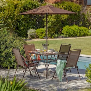 Resumo das caracteristicas e especificacoes do produto: - Modelo: Menorca - Numero de pecas: 6 - Peso maximo suportado: 100 kg - Material do tampo: Vidro - Incluso: 4 cadeiras, 1 ombrelone e 1 mesa de vidro retangular - Capacidade: 4 pessoas - Material da estrutura: Aco - Material da superficie: TEXTILENO - Estilo do produto: Area Externa - Uso: Lar - Cor: Marrom - Dimensoes do produto: Comprimento 85 cm, Largura 85 cm, Altura 17 cm - Peso bruto: 33,500 kg - Peso liquido: 33,500 kg - Material: Metal e aluminio - Garantia: 3 meses - Medidas das cadeiras: (AxLxP) 92x56x75 cm - Medidas da mesa: (AxLxP) 70x85x85 cm - Origem: Importado." Marca: Não Informado