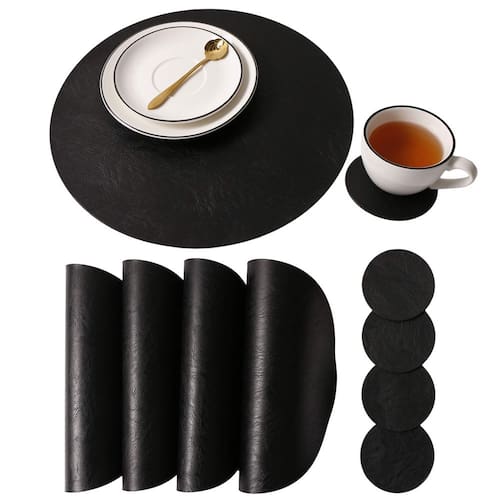 Sobre a Jovono: uma marca focada em jogos americanos de alta qualidade. Elegante e sofisticado, que é uma escolha desejável para adicionar um apelo moderno e alto estilo para organizar sua louça. A superfície do jogo americano, feita de couro sintético, torna fácil entreter seus convidados com estilo. Eles são adequados para mesa de jantar, para mesa de jardim ou para o restaurante e hotel da sua família. Os jogos americanos podem ser utilizados para outras finalidades como cobrir seus balcões ou almofada de mesa de computador. Os jogos americanos JOVONO são feitos de material de poliéster de couro sintético 100% durável e vêm em uma variedade de cores e designs. Benefícios do material para jogos americanos de couro PVC PK --- 1, Não permite que líquidos e migalhas passem pela mesa 2, A textura da barriga aumenta a resistência ao deslizamento Algodão PK --- 1, fácil de limpar 2, sem rugas, sem encolhimento Outros materiais --- Elegância de alta qualidade, vida de qualidade Instruções de cuidados: 1. Limpeza --- Basta limpar com um pano úmido e estará limpo como novo. Não enxágue ou use água diretamente para lavar. 2. Resistente ao calor --- não coloque uma panela quente acima de 38 °C nos tapetes. 3. Armazenamento --- Você pode empilhá-los um no outro para o seu armário. Características: 1. À prova d'água --- jogos americanos de jantar com material PU não permitem que líquidos e migalhas passem direto 2, não escorrega: elegante padrão em relevo adiciona design de textura a uma superfície lisa, fortalece o atrito, antiderrapante 3 Fácil de limpar --- Fácil de usar um pano úmido ou uma toalha de papel para limpar - Conjunto de 6 jogos americanos e 6 porta-copos, diâmetro redondo de 33 cm (jogo americano), 9,9 cm (porta-copos) - Possui jogos americanos antiderrapantes, resistentes à água e manchas, glamour para casa, sobremesa, cafeteria e muito mais - O tapete é duplamente engrossado e ambos os lados podem ser utilizados, melhorando o efeito de isolamento e protegendo a mesa de jantar - Feito de material 100% poliéster de couro sintético durável - Fácil de cuidar, limpe, seca muito rapidamente