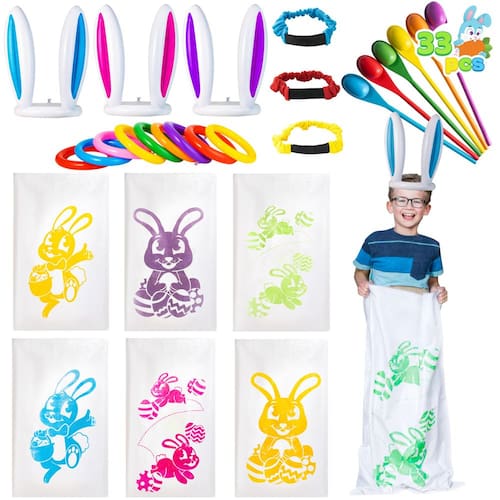 JOYIN Saco de batata para 6 jogadores, corrida de colher e ovo, faixas de cabeça de orelhas de coelho com anéis infláveis, faixas de corrida de revezamento com pernas corda elástica para lembrancinha de festa temática de Páscoa, jogo de atividade familiar, jogos ao ar livre, atividades de caça aos ovos de Páscoa Supervalor. Nosso divertido conjunto de jogos ao ar livre inclui 6 colheres e ovos, 6 sacos de salto, 3 orelhas de coelho, 9 anéis infláveis e 3 gravatas.
