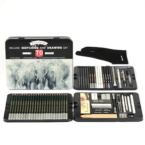 Material: Caixa de ferro Tamanho de madeira: 24 cm × 20 m × 4 cm Peso: 500 g Conjunto completo de desenho: este conjunto de lápis de desenho de 70 peças inclui uma ampla variedade de lápis de grafite de alta qualidade, lápis de carvão, tocos de mistura, borrachas e outros materiais de desenho essenciais para todos os artistas. Lápis versáteis: com lápis de graus duros a macios (4H a 8B), este conjunto permite esboços detalhados, sombreamento e mistura suave, tornando-o ideal para artistas iniciantes e avançados. Ideal para vários estilos de arte: perfeito para esboçar, sombrear e desenhar obras de arte detalhadas, este conjunto é adequado para artistas que trabalham em vários estilos, incluindo retratos, paisagens e arte abstrata. Portátil e organizado: todos os itens são bem organizados em uma caixa de lata durável e portátil com compartimentos para fácil acesso, mantendo seus suprimentos seguros e arrumados onde quer que você vá. Ótimo para todos os níveis de habilidade: seja você um aspirante a artista ou um profissional experiente, este conjunto oferece tudo o que é necessário para aprimorar suas habilidades de esboço e desenho.