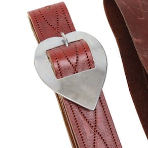 Um Conjunto Látego e Contra Látego da marca A Pantaneira fabricado em couro na cor Havana. O contra látego possui couro duplado com costuras reforçadas, fivela de aço inox modelo Coração e passador trançado em couro meio cortume e o látego é fixado por tento de couro.