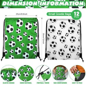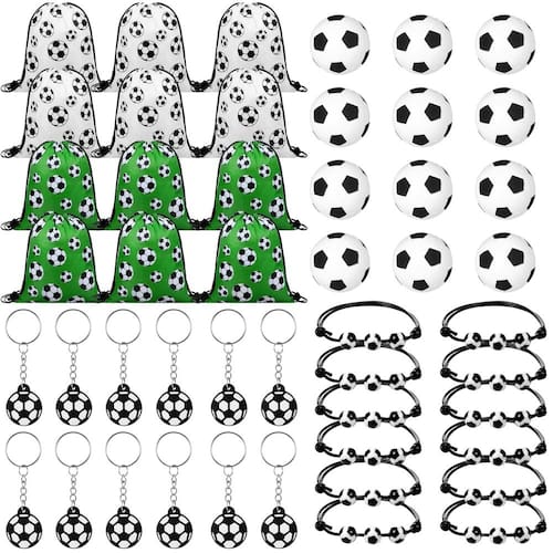 - Conteúdo da embalagem: o conjunto de lembrancinhas de festa de futebol inclui 12 mochilas de cordão de futebol, 12 mini bolas de futebol, 12 chaveiros de futebol, 12 pulseiras trançadas de fio de cera de futebol; rico em quantidade e estilo, o suficiente para atender às suas necessidades de uso diário e também pode ser compartilhado com membros do seu time e mostrar o estilo do time