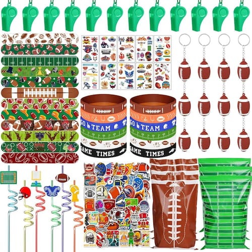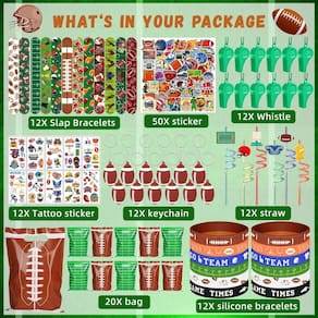 - ?Conjunto de presente de decoração de festa de futebol?Este conjunto de lembrancinhas temáticas de futebol americano contém 12 pulseiras de silicone de futebol, 12 apitos, 12 chaveiros de futebol, 12 pulseiras de tapa, 12 adesivos de tatuagem, 12 canudos de plástico, 12 sacos de presente, 50 adesivos de futebol. Crianças e adultos vão adorar estes artigos de festa de futebol! É um presente perfeito de lembrancinhas de festa de futebol para decoração de festa de aniversário de futebol infantil.