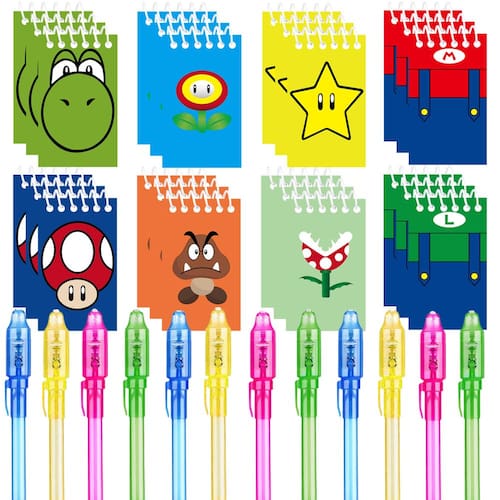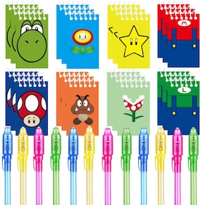 - Canetas mágicas para lembrancinhas do Super Bros - escreva com a caneta de tinta que desaparece nos mini blocos de notas. Essas incríveis canetas mágicas permanecem em segredo até que a luz da caneta brilhe no escuro, ótima alternativa sem bagunça para qualquer livro de colorir