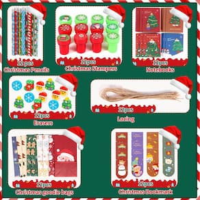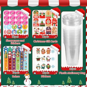 - Presentes de festa de Natal: você receberá 12 lápis de Natal, 12 canecas de plástico, 12 borrachas, 24 réguas, 12 carimbos de Natal, 12 apontadores, 28 adesivos, 12 vales-presente de Natal, 12 marcadores de Natal, 12 cadernos, 12 sacolas de presentes de Natal. Conjunto de papelaria de Natal super econômico para seu uso.