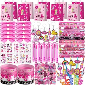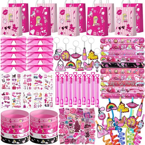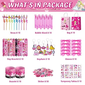 - Conjunto completo de lembrancinhas de festa rosa: nosso conjunto de 120 peças inclui tudo o que você precisa para tornar a festa com tema rosa da sua filha inesquecível, incluindo 50 adesivos, 10 pulseiras, 10 chaveiros, 10 tatuagens, 10 canudos, 10 sacos de presente, 10 varinhas de bolhas, 10 pulseiras