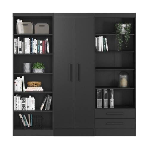 Conjunto De Livreiros 3 Módulos Com 2 Portas E 2 Gavetas Preto Fosco - Qmovi Preto Fosco Conjunto de Livreiros 3 Módulos com 2 Portas e 2 Gavetas - Qmovi O Conjunto de Livreiros 3 Módulos combinam design moderno com funcionalidade. Livreiro Multiuso com prateleiras ajustáveis e sistema antitombamento para e versatilidade. Multiuso 2 Portas com espaço extra, prateleiras móveis e suporte lateral, ideal para qualquer ambiente. Livreiro 2 Gavetas com estilo contemporâneo, prateleiras reguláveis e gavetas espaçosas para organização eficaz. Este conjunto é a solução completa para organizar e embelezar sua casa com e praticidade. ESPECIFICAÇÕES: - Estrutura em MDP - Pintura UV atóxica - 2 Gavetas - 2 Portas - Corrediças metálicas - Dobradiças metálicas - Prateleiras móveis - Puxadores resistentes em MDF - Pés em PVC - Suporte externo para pendurar objetos - Sistema antitombamento - Móvel multifuncional - Ideal para livros e objetos decorativos