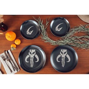 - Design inspirado em Mandaloriano: este conjunto de louças colecionáveis de Star Wars apresenta um acabamento manchado em cinza escuro com detalhes prateados inspirados em beskar. Cada peça apresenta um design exclusivo que faz referência a The Mandalorian, incluindo símbolos e citações.
