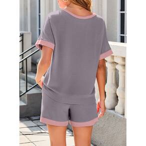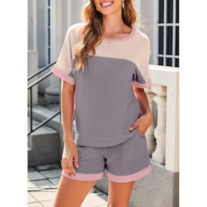 - Características: Roupas femininas Dokotoo de 2 peças, conjuntos combinando com lounge, tops e shorts de manga curta com gola redonda e cor block.