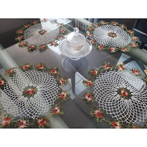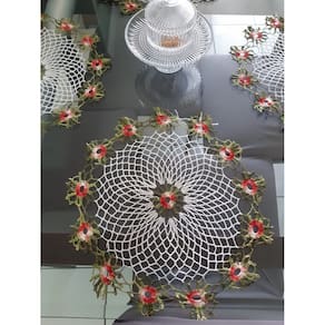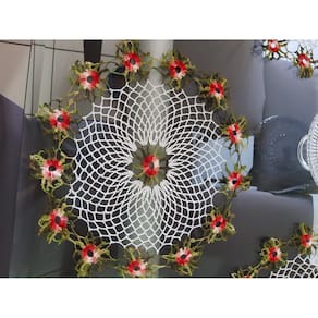 Conjunto de lugar americano com 4 peças circulares, com dimensão de 38 centímetros de diâmetro, confeccionado em renda, cuja cor predominante é o branco ao centro e com as bordas finalizadas em formato de flor na cor predominante verde, com detalhes em branco e vermelho. Marca: Ideias by Sandra