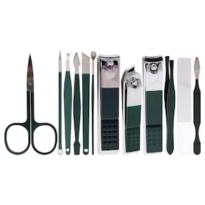 Conjunto de manicure UNDN para mulheres — verde escuro, kit de higiene de 12 peças com tesoura, microtesoura, pinça e ferramentas para cuidar de unhas —
