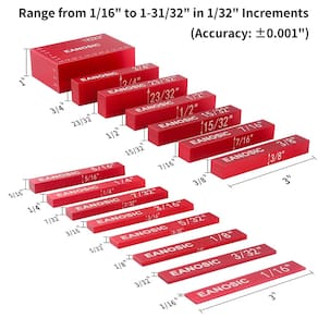 EANOSIC Conjunto de 15 peças de combinação de medidores quadrados de metal sólido de liga de alumínio para montagem de blocos de altura para marcenaria 1. Fácil para você definir cercas e alturas de corte 2. Empilhe barras de configuração para uma ampla variação ou tamanhos ou use por conta própria - Isso oferece um intervalo de 1/40.6 cm a 1-31/81.3 cm em incrementos de 1/81.3 cm. A espessura de cada um dos blocos é usinada com precisão de 0 cm. - O bloco de 2,5 cm x 5 cm x 7,6 cm é um pilar na oficina mecânica e é uma das ferramentas mais úteis que a maioria dos marceneiros nunca soube que existia. O bloco 1-2-3, em combinação com os blocos de configuração mencionados acima, estenda sua faixa de medidas para 16 cm se você usar todos os blocos em combinação. 3. Os tamanhos em cada barra são marcados com gravação a laser para um trabalho rápido preciso e medições fáceis 4. Inclui um estojo de armazenamento de plástico para fácil acesso e proteção Conteúdo da embalagem: 15 medidores de barra de blocos de configuração. - Os blocos de configuração podem definir facilmente a altura da cerca, brocas de lâminas e outros cortadores de acordo com as necessidades, o que é mais rápido e preciso do que usar uma régua combinada. - Combine barras para configurar centenas de medidas. Empilhe barras de configuração para uma ampla variação ou tamanhos, ou use sozinho, trabalhe e meça rapidamente. - Os blocos de calibre configurados têm 7,6 cm de comprimento. Tamanhos precisos do conjunto de blocos de medidores de serra: 1/40.6 cm, 3/81.3 cm, 1/20.3 cm, 5/81.3 cm, 3/40.6 cm, 7/81.3 cm, 1/10.2 cm, 5/40.6 cm, 3/20.3 cm, 7/40.6 cm, 15/40.6 cm, 15/16 /81.3 2,5 cm, 1,2 cm, 23/81.3 cm, 3/10.2 cm, 2.5x5.1x7.6 cm - Etiquetas gravadas a laser fáceis de ler em cada bloco. Capa ajustada incluída, para que o quadrado combinado fique mais firmemente protegido durante o transporte. - Estrutura de alumínio sólido anodizado preto com 15 peças para proteger melhor as brocas e serras.