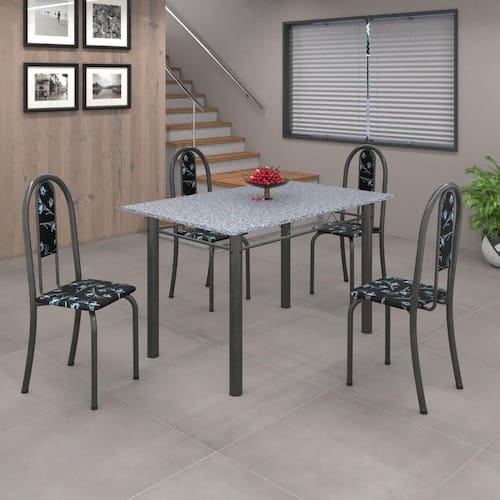 Quer deixar sua casa completa com um toque especial? Uma dica bacana de como transformar sua cozinha, deixando-a mais receptiva e bonita? Então você precisa de móveis indispensáveis para deixar seu lar muito mais aconchegante, receptivo e sempre disponível para receber a visita de amigos, familiares e convidados. Você vai se apaixonar por este incrível Conjunto de Mesa com 4 Cadeiras IRIS A. Ideal para cozinha, ele é a marromhor opção para completar o espaço. Aproveite!! Acabamento da Cadeira/Banco: Pintura Texturizada Acabamento da Mesa: Pintura Texturizada Ambiente Principal: Cozinha Cadeira/Banco estofada: Sim Cadeira/Banco suporta até: 120 Complexidade da Montagem: Média: pode ser montado por mais de uma pessoa e/ou necessite de maior conhecimento para montagem Cor: Preto Floral/Martelado Prata/Granito Cor do Produto: Preto Floral/Martelado Prata/Granito Enchimento do Assento: Espuma D-16 Escala de Brilho: Fosco Espessura do Tampo: 20 Estrutura do Assento: MDP 15mm Itens Inclusos: 1 Mesa, 4 Cadeiras, Kit Ferragens e Manual de Montagem Manual de Montagem e Instalação: https://cdn2.madeiramadeira.com.br/atributo/soma-moveis-ltda/1216426-iris-a2-iris-a1-merged.pdf Material da Base da Mesa: Aço Material da Estrutura da Cadeira: Aço Medida da Cadeira/Banco (A x L x P): 96 cm x 36 cm x 41 cm Medida da Mesa (A x L x P): 75 cm x 75 cm x 120 cm Medida do Tampo (L x C x E): 75 cm x 120 cm x 2 Mesa suporta até: 15 Necessita Montagem: Sim Origem do Produto: Nacional Peso da Cadeira/Banco: 4.28 Peso da Mesa: 58 kg Possui Apoio Para os Pés: Não Recomendações de Uso, Manutenção e Limpeza: Não permitir que molhe os pés da base, usar um pano de tecido macio e seco, evitar detergentes, alvejantes e produtos químicos de limpeza; no tampo usar tecido macio levemente umedecido. Revestimento da Cadeira/Banco: Couro Ecológico Sistema de Montagem: Parafusos