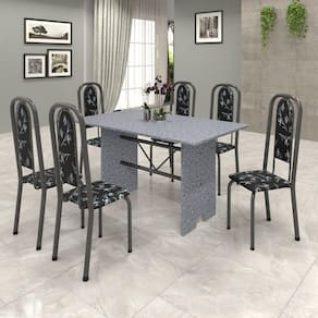 Quer deixar sua casa completa com um toque especial? Uma dica bacana de como transformar sua cozinha, deixando-a mais receptiva e bonita? Então você precisa de móveis indispensáveis para deixar seu lar muito mais aconchegante, receptivo e sempre disponível para receber a visita de amigos, familiares e convidados. Você vai se apaixonar por este incrível Conjunto de Mesa com 6 Cadeiras Lavínea. Ideal para cozinha, ele é a marromhor opção para completar o espaço. Aproveite!! Acabamento da Cadeira/Banco: Pintura Texturizada Acabamento da Mesa: Acetinado Almofada do assento: Fixa Altura do Conjunto: Ambiente Principal: Cozinha Apoio para Braços Estofado: Cadeira/Banco estofada: Sim Cadeira/Banco suporta até: 120 Complexidade da Montagem: Baixa: pode ser montado por uma pessoa sozinha Cor: Martelado Prata/Ocre/Preto Floral Cor do Produto: Martelado Prata/Ocre/Preto Floral Enchimento do Assento: Espuma D-16 Enchimento do Encosto: Escala de Brilho: Semi-Brilho Espessura do Tampo: 15 Estrutura do Assento: MDP 15mm Estrutura do Encosto: Informações Complementares: Itens Inclusos: 1 Mesa, 6 Cadeiras, Kit Ferragens e Manual de Montagem Linha ou Coleção: Lavinea Manual de Especificação Técnica: Manual de Montagem e Instalação: https://cdn2.madeiramadeira.com.br/atributo/soma-moveis-ltda/1157912-lavinea.pdf Material da Base da Mesa: Granito Material da Estrutura da Cadeira: Aço Medida da Base (A x L x P): Medida da Cadeira/Banco (A x L x P): 108x37x40cm Medida da Mesa (A x L x P): 75x75x140cm Medida do Canto Alemão (A x L x P): Medida do Suporte Giratório (L x C x E): Medida do Tampo (L x C x E): 140x75x1,5cm Mesa suporta até: 10 Necessita Montagem: Sim Origem do Produto: Nacional Peso da Cadeira/Banco: 3.82 Peso da Mesa: 85.03 Possui Apoio para Braços: Não Possui Apoio Para os Pés: Não Possui Suporte Giratório: Não Recomendações de Uso, Manutenção e Limpeza: Não permitir que molhe os pés da base, usar um pano de tecido macio e seco, evitar detergentes, alvejantes e produtos químicos de limpeza; no tampo usar tecido macio levemente umedecido. Revestimento da Cadeira/Banco: Couro Ecológico Sistema de Montagem: PARAFUSOS Tipo de Madeira Maciça da Base da Mesa: Tipo de Madeira Maciça do Tampo: Vidro Temperado: