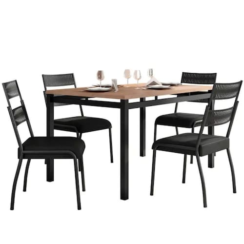 Ficha Técnica Marca Fabone Modelo Mesa: Valencia e Cadeira: Atenas Tipo Conjunto de mesa Quantidade de lugares 4 lugares Formato Retangular Peso suportado da mesa 90 kg Material da estrutura da mesa Aço carbono Material do tampo MDP BP Espessura do tampo 0,75 cm Peso suportado da cadeira 80 kg Material da estrutura da cadeira Aço carbono Acabamento da cadeira MDP Encosto estofado Não Altura Mesa: 76,5 cm e Cadeira: 92,5 cm Largura Mesa: 80 cm e Cadeira: 46 cm Profundidade Mesa: 136 cm e Cadeira: 61 cm Peso Mesa: 22,46 kg e Cadeira: 5,55 kg