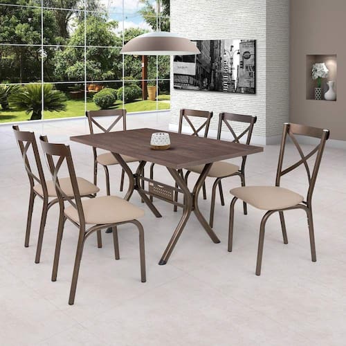 O Conjunto de Mesa e Cadeiras Karina é O Conjunto ideal para sua sala de jantar ou cozinha, possui um designer moderno. com tampo de BP Amêndoa de 1,36m x 0,80m, possui textura em 3D (que imita a madeira marroml) , mais leve permitindo a movimentação para limpeza do piso e revestimento dupla face. Suas 6 Cadeiras possuem assento anatômico e sistema de fixação com porca agarras, que proporcionam maior conforto e comodidade. Além disso suas ponteiras de proteção interna nos pés, que garante maior proteção contra riscos e ferrugem. Medida da Mesa (A x L x P): 76cm x 80cm x 136cm Peso da Mesa: 17 kg Mesa suporta até: 10.0000 Acabamento da Cadeira/Banco: Pintura Epóxi Acabamento da Mesa: Pintura Epóxi Almofada do assento: Removível Altura do Conjunto: 75 cm Ambiente Principal: Sala de Jantar Apoio para Braços Estofado: Sim Cadeira/Banco estofada: Sim Cadeira/Banco suporta até: 100.0000 codigo_ean: 7898148439096 Complexidade da Montagem: Baixa: pode ser montado por uma pessoa sozinha Cor: Bronze/Linho Bege Cor do Produto: Bronze/Linho Bege Enchimento do Assento: Espuma D-14 Escala de Brilho: Semi-Brilho Espessura do Tampo: 30 mm Estrutura do Assento: Pinus Compensado/Espuma Estrutura do Encosto: Aço Formato do Tampo: Retangular Itens Inclusos: 1 Base de Mesa, 1 Tampo, 6 Cadeiras, Kit de Montagem e Manual de Montagem Linha ou Coleção: Karina Manual de Montagem e Instalação: https://product-hub-prd.madeiramadeira.com.br/567402/documents/b3d3dc37-c675-4704-8f40-99febf2209b4ee09c451520280manual276108.pdf Material da Base da Mesa: Aço Material da Estrutura da Cadeira: Aço Material do Tampo: MDF/MDP Medida da Base (A x L x P): 74cm x 59cm x 75cm Medida da Cadeira/Banco (A x L x P): 91,5cm x45,5 x 51cm Medida do Tampo (L x C x E): 80cm x 136cm x 3cm Necessita Montagem: Sim Origem do Produto: Nacional Peso da Cadeira/Banco: 4 kg Possui Apoio para Braços: Não Possui Apoio Para os Pés: Não Possui Suporte Giratório: Não Quantidade de Cadeiras: 6 Quantidade de Lugares: 06 Recomendações de Uso, Manutenção e Limpeza: Limpar com pano levemente umedecido. Não usar produtos abrasivos que possam danificar a superfície do móvel. Revestimento da Cadeira/Banco: Couro Ecológico Sistema de Montagem: Parafuso Ean: 7898148439096