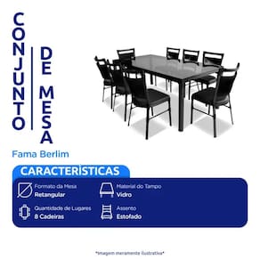 Conjunto de Mesa 8 Cadeiras Berlim Cadeiras Fama O Conjunto de Mesa Berlim foi desenvolvido para quem não abre mão de sofisticação e qualidade. Com um design que une o moderno ao funcional, ele é a escolha perfeita para valorizar seu espaço, oferecendo um visual elegante e materiais que garantem uma longa vida útil ao produto. Confira mais detalhes: