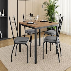 Transforme suas refeições em momentos ainda mais especiais com nosso conjunto de Mesa Adriana. Com um design moderno e versátil, ele combina perfeitamente com diversos estilos de decoração, proporcionando conforto e charme para o seu ambiente. Seja para cafés da manhã em família, jantares especiais ou encontros com amigos, este conjunto é a escolha certa para quem busca qualidade, funcionalidade e bom gosto. Acabamento da Cadeira/Banco: Pintura Epóxi Acabamento da Mesa: Pintura Epóxi Ambiente Principal: Cozinha Cadeira/Banco estofada: Somente Assento Estofado Cadeira/Banco suporta até: 120 kg codigo_ean: 7900288142054 Complexidade da Montagem: Média: pode ser montado por mais de uma pessoa e/ou necessite de maior conhecimento para montagem Configuração do Conjunto: Mesa com Cadeiras Cor: Preto/Platina Cor da Base: Preto Cor do Produto: Preto/Platina Cor do Tampo: Marrom De Canto (Canto Alemão): Não Escala de Brilho: Semi-Fosco Espessura do Tampo: 30 mm Estrutura do Assento: mdp/12 Estrutura do Encosto: Aço Carbono Formato do Tampo: Quadrado Informações Complementares: Tampo em Revestimento Bp/ Produtos Embalado com Papelão e Plastico Termoecolhivel Itens Inclusos: 1 Mesa, 4 Cadeiras, Kit Ferragens e Manual de Montagem Manual de Montagem e Instalação: https://cdn2.madeiramadeira.com.br/atributo/artefamol/2895556-5273-17461488629655.pdf Marca: Artefamol Material da Base da Mesa: Aço Carbono Material da Estrutura da Cadeira: Aço Carbono Material Principal das Cadeiras/Bancos: Aço Carbono Medida da Cadeira/Banco (A x L x P): 90x36x53 Medida da Mesa (A x L x P): 78x90x90 Medida do Tampo (L x C x E): 90x90x3 Mesa Dobrável: Não Mesa Extensível: Não Mesa suporta até: 60 kg Montagem Flex: Não Necessita Montagem: Sim Origem do Produto: Nacional Peso da Cadeira/Banco: 3,18 kg Peso da Mesa: 17,01 kg Possui Apoio para Braços: Não Possui Apoio Para os Pés: Não Possui Prateleiras: Não Possui Rodízio: Não Possui Suporte Giratório: Não Possui Vidro: Não Quantidade de Cadeiras: 4 Recomendações de Uso, Manutenção e Limpeza: Para manter seu móvel novo por muito mais tempo, evite locais úmidos, mantenha-o distante de líquidos e de fontes de calor. Evite a exposição prolongada ao sol. Para limpá-lo com segurança utilize uma flanela seca sem produtos abrasivos e nem lustra móveis. Sistema de Montagem: Pafusos, sapatas, arruelas Tipo de Assento: Fixo Tipo de Encosto: Fixo
