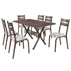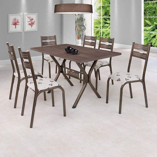 Que tal deixar sua cozinha ainda mais bonita com O Conjunto de Mesa e Cadeiras Luna? Ele possui um designer moderno, com tampo de BP Amêndoa de 136cm, possui textura em 3D (que imita a madeira natural) , mais leve permitindo a movimentação para limpeza do piso e revestimento dupla face. Suas 6 Cadeiras possuem assento anatômico e sistema de fixação com porca agarras, que proporcionam maior conforto e comodidade. Além disso suas ponteiras de proteção interna nos pés, que garante maior proteção contra riscos e ferrugem. Espessura do Tampo: 30 mm Peso da Cadeira/Banco: 3 kg Peso da Mesa: 17 kg Medida da Base (A x L x P): 74cm x 59cm x 75cm Medida da Cadeira/Banco (A x L x P): 91cm x 47cm x 46,5cm Medida da Mesa (A x L x P): 76cm x 80cm x 136cm Altura (cm): 91 cm Largura (cm): 136 cm Garantia: 06 Meses Acabamento da Mesa: Pintura Epóxi Escala de Brilho: Semi-Brilho Material Principal das Cadeiras/Bancos: Aço Material do Tampo: MDF/MDP Acabamento da Cadeira/Banco: Pintura Epóxi Material da Base da Mesa: Aço Material da Estrutura da Cadeira: Aço Carbono Quantidade do Produto: 6 Cadeiras Cor: Bronze/Bege Geométrico Almofada do Assento: Removível Marca: Ciplafe Quantidade de Lugares: 6 Possui Apoio para Braços: Não Linha ou Coleção: Luna Cadeira/Banco Suporta Até: 100 kg Cadeira/Banco Estofada: Sim Formato do Tampo: Retangular Enchimento do Assento: Espuma D-14 Possui Apoio para os Pés: Não Possui Suporte Giratório: Não Cor do Produto: Bronze/Bege Geométrico Formato da Mesa: Retangular Mesa Suporta Até: 10 kg Medida do Tampo (L x C x E): 80cm x 136cm x 3cm Estrutura do Assento: Pinus Compensado/Espuma Estrutura do Encosto: Aço Carbono Formato: Retangular Quantidade de Cadeiras: 6 Origem do Produto: Nacional Ambiente Principal: Cozinha Cor Predominante: Marrom