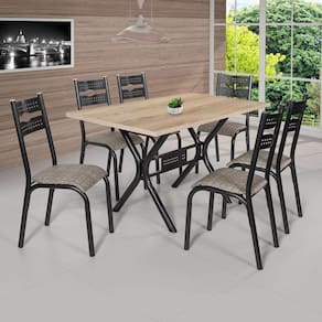 Que tal deixar sua cozinha ainda mais bonita com O Conjunto de Mesa e Cadeiras Luna? Ele possui um designer moderno, com tampo de BP Carvalho Montreal de 136cm, possui textura em 3D (que imita a madeira natural), mais leve permitindo a movimentação para limpeza do piso e revestimento dupla face. Suas 6 Cadeiras possuem assento anatômico e sistema de fixação com porca agarras, que proporcionam maior conforto e comodidade. Além disso suas ponteiras de proteção interna nos pés, que garante maior proteção contra riscos e ferrugem. Medida da Mesa (A x L x P): 76cm x 80cm x 136cm Peso da Mesa: 17 kg Mesa suporta até: 10 kg Acabamento da Cadeira/Banco: Pintura Epóxi Acabamento da Mesa: Pintura Epóxi Almofada do assento: Removível Cadeira/Banco estofada: Sim Cadeira/Banco suporta até: 100 kg calculo: unidade Complexidade da Montagem: Baixa: pode ser montado por uma pessoa sozinha Cr: Craqueado Preto/Junco Manteiga Cr do Produto: Craqueado Preto/Junco Manteiga Enchimento do Assento: Espuma D-14 Escala de Brilho: Semi-Brilho Espessura do Tampo: 30 mm Estrutura do Assento: Estrutura de madeira pinus compensados, porca agarra metálicas, espuma e courino sintético 20mm Estrutura do Encosto: Aço Carbono Formato do Tampo: Retangular Itens Inclusos: 1 Mesa 6 Cadeiras e Manual de Montagem Linha ou Coleção: Luna Manual de Montagem e Instalação: https://cdn2.madeiramadeira.com.br/atributo/m-veis-ciplafe/558509-manual-284-108.pdf Material da Base da Mesa: Aço Material da Estrutura da Cadeira: Aço Carbono Material do Tampo: MDF/MDP Medida da Base (A x L x P): 74cm x 59cm x 75cm Medida da Cadeira/Banco (A x L x P): 91cm x 47cm x 46,5cm Medida do Tampo (L x C x E): 80cm x 136cm x 3cm Necessita Montagem: Sim Origem do Produto: Nacional Peso da Cadeira/Banco: 3 kg Possui Apoio para Braços: Não Possui Apoio Para os Pés: Não Quantidade de Lugares: 06 Recomendações de Uso, Manutenção e Limpeza: Limpar com pano levemente umedecido. Não usar produtos abrasivos que possam danificar a superfície do móvel. Revestimento da Cadeira/Banco: Sistema de Montagem: Parafusos status-cadastro: Aprovado Tamanho: