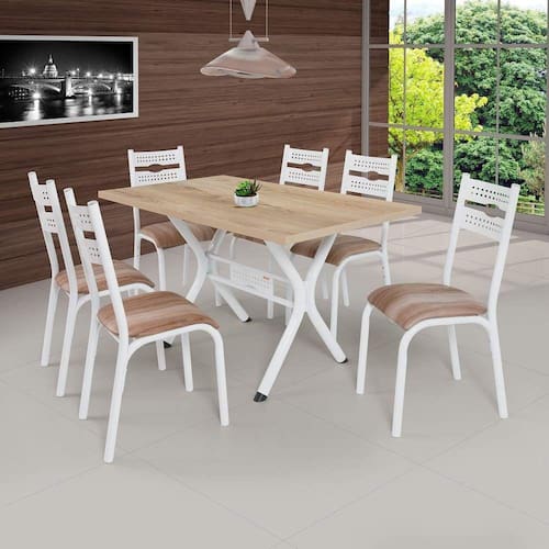 O Conjunto de Mesa e Cadeiras Luna, possui um designer moderno, que vai deixar a sua cozinha ainda mais bonita. Com tampo de BP Carvalho Montreal de 1,36m x 0,80m, possui textura em 3D (que imita a madeira natural), mais leve permitindo a movimentação para limpeza do piso e revestimento dupla face. Suas 06 Cadeiras possuem assento anatômico e sistema de fixação com porca agarras, que proporcionam maior conforto e comodidade. Além disso suas ponteiras de proteção interna nos pés, que garante maior proteção contra riscos e ferrugem.