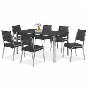 CADEIRAS: 12 Pés de Aço Cromado 7/8? 24 Sapatas Plástica Preta 24 Ponteiras ABS Cromada 7/8? -Fixadas na Cadeira- 6 Encostos Estrutura de Aço Acabamento em Junco Sintético -Marrom J03- -Preto J18- Junco Com Proteção Anti UV -não resseca e não perde a coloração- 6 Assentos com Estrutura em Madeira nas Laterais para fixação dos Pés e Compensado 12mm Espuma D-23 com 2,5cm de espessura Forro de acabamento na parte inferior do Assento em TNT preto Revestimento Corino Emborrachado Preto -BC-83- Marrom -BC-82-