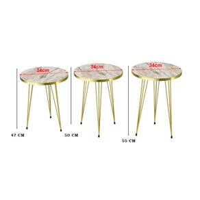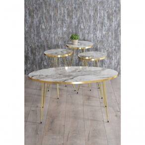 Conjunto De Mesa De Centro 4 Peças - Mármore Branco Conjunto de mesa ; de centro com 4 peças de tamanhos e alturas diferentes na cor mármore branco ; Conjunto de mesas de centroEste conjunto de mesas é versátil e adapta-se perfeitamente à sua sala de estar, por exemplo, e permite-lhe poupar espaço, pois encaixam umas nas outras. As mesas de centro são uma peça essencial de mobiliário em qualquer sala de estar, servindo como uma superfície funcional e decorativa para guardar bebidas e outros itens. Mesa de apoio ideal para as suas jarras, vasos de flores e muito mais. O conjunto de mesas de encaixe é uma opção de economia de espaço para móveis de casa ou escritório. Elas são versáteis e podem ser em uma variedade de configurações, de salas de estar a escritórios. Elas são uma ótima opção para maximizar metragem quadrada e para usar quando necessário e armazenar quando não for necessário. Conjunto composto por uma mesa oval e 3 mesas redondas.Material:- ;Tampo: MDP- Pernas: metalDimensões: (largura x comprimento)- Mesa Oval (largura x comprimento x altura): 50 x 90 x 43cm- Mesa redonda n. 1 (largura x altura): 34 x 47cm- Mesa redonda n. 2(largura x altura): 34 x 50cm- Mesa redonda n. 3(largura x altura): 34 x 55 cmCor:- Tampo: mármore branco ;- Pernas: douradoConteúdo da embalagem: 1 conjunto de 4 mesas de centro (tamanhos diferentes)Observação: Produto não vai montado e não nos responsabilizamos pela montagem. Ean: 7898726226926