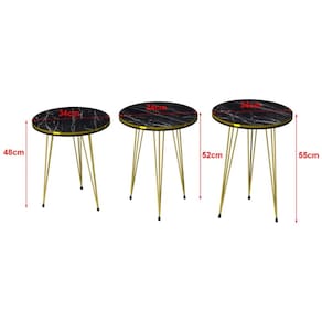Conjunto de mesa de centro com 4 peças de tamanhos e alturas diferentes na cor mármore preto com dourado. Conjunto de mesas de centroConjunto composto por uma mesa oval e 3 mesas redondas.Material: Tampo: MDP preto - Pernas: metal douradoDimensões: (largura x comprimento)Mesa Oval (largura x comprimento x altura)50 x 90 x 43cmMesa redonda n.º 1 (largura x altura): 34 x 47cm Mesa redonda n.º 2(largura x altura): 34 x 50cmMesa redonda n.º 3(largura x altura): 34 x 55 cmCor:- Tampo: mármore preto com dourado - Pernas: douradoConteúdo da embalagem: 1 conjunto de 4 mesas de centro (tamanhos diferentes)Observação: Produto não vai montado e não nos responsabilizamos pela montagem.