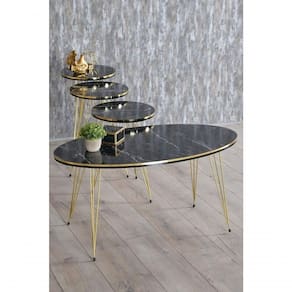 Conjunto De Mesa De Centro 4 Peças - Mármore Preto Com Dourado Conjunto de mesa ;de centro com 4 peças de tamanhos e alturas diferentes na cor marmore preto com dourado. Conjunto de mesas de centroEste conjunto de mesas é versátil e adapta-se perfeitamente à sua sala de estar, por exemplo, e permite-lhe poupar espaço, pois encaixam umas nas outras. As mesas de centro são uma peça essencial de mobiliário em qualquer sala de estar, servindo como uma superfície funcional e decorativa para guardar bebidas e outros itens. Mesa de apoio ideal para as suas jarras, vasos de flores e muito mais. O conjunto de mesas de encaixe é uma opção de economia de espaço para móveis de casa ou escritório. Conjunto Elas são versáteis e podem ser em uma variedade de configurações, de salas de estar a escritórios. Elas são uma ótima opção para maximizar metragem quadrada e para usar quando necessário e armazenar quando não for necessário. Conjunto composto por uma mesa oval e 3 mesas redondas.Material:- Tampo: MDP ; mármore preto - Pernas: ; metal dourado ; ;Dimensões: (largura x comprimento)- Mesa Oval (largura x comprimento x altura): 50 x 90 x 43cm- Mesa redonda n. 1 (largura x altura): 34 x 47cm- Mesa redonda n. 2(largura x altura): 34 x 50cm- Mesa redonda n. 3(largura x altura): 34 x 55 cmCor:- Tampo: mármore preto com dourado - Pernas: douradoConteúdo da embalagem: 1 conjunto de 4 mesas de centro (tamanhos diferentes)Observação: Produto não vai montado e não nos responsabilizamos pela montagem. Ean: 7898726226896