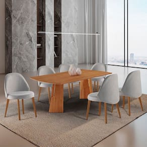 Mais do que um conjunto, a Mesa Bia e as Cadeiras Ester convidam você a viver experiências memoráveis, unindo conforto, elegância e uma atmosfera acolhedora que transforma cada refeição em um momento especial. Medida da Mesa (A x L x P): 80 x 180 x 90 cm Peso da Mesa: 25,6 kg Mesa suporta até: 30 kg Acabamento da Cadeira/Banco: Pintura Acabamento da Mesa: Verniz Acompanha Manual de Instalação: Não Almofada do assento: Fixa Ambiente Principal: Sala de Jantar Cadeira/Banco Estofada: Encosto e Assento Estofados Cadeira/Banco estofada: Encosto e Assento Estofados Cadeira/Banco suporta até: 120 kg Cadeira/Banco Suporta Até: 120.0000 codigo_ean: 7900288365590 Complexidade da Montagem: Média: pode ser montado por mais de uma pessoa e/ou necessite de maior conhecimento para montagem Configuração do Conjunto: Mesa com Cadeiras Cor: Quartzo / Imbuia Natural / Cinamomo Imbuia Cor do Produto: Quartzo / Imbuia Natural / Cinamomo Imbuia Cor Flex: Não Cor Secundária: Cinza De Canto (Canto Alemão): Não Enchimento do Assento: Espuma D-26 Escala de Brilho: Semi-Brilho Espessura do Tampo: 40 mm Estrutura do Assento: Madeira Maciça Formato do Tampo: Retangular Informações Complementares: As cadeiras são entregues totalmente montadas e prontas para uso, enquanto a mesa chega pré-montada, facilitando a instalação e garantindo praticidade. Itens Inclusos: 1Mesa, 6 Cadeiras e Kit Ferragem Linha ou Coleção: Bia/Ester Manual de Montagem e Instalação: https://product-hub-prd.madeiramadeira.com.br/642789576/documents/329dfd40-3227-4807-a913-81a94af439f83464525584417746158200753.pdf Marca: Mobilare Material da Base da Mesa: MDF Laminado/Madeira Maciça Material da Estrutura da Cadeira: Madeira Maciça Material do Tampo: Laminado Material Principal: Madeira Maciça/MDF Material Principal das Cadeiras/Bancos: Madeira Maciça Medida da Cadeira/Banco (A x L x P): 90 x 51 x 54 cm Medida do Tampo (L x C x E): 180 x 90 x 4 cm Mesa Dobrável: Não Mesa Extensível: Não Montagem Flex: Não Necessita Montagem: Sim Origem do Produto: Nacional Peso da Cadeira/Banco: 7,1 kg Possui Apoio para Braços: Não Possui Apoio Para os Pés: Não Possui Prateleiras: Não Possui Vidro: Não Quantidade de Cadeiras: 6 Quantidade de Lugares: 06 Recomendações de Uso, Manutenção e Limpeza: Limpar com pano seco Revestimento da Cadeira/Banco: Linho Sistema de Montagem: Parafusos Tipo de Assento: Fixo Tipo de Encosto: Fixo