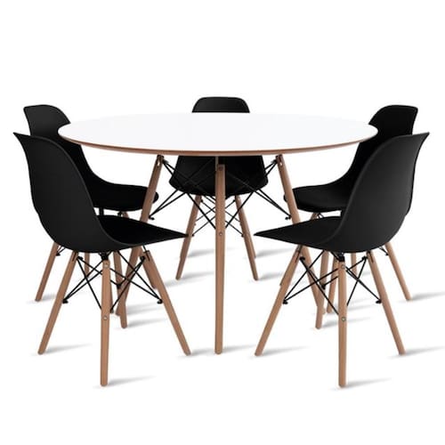 Conjunto de Mesa de Jantar Eames Eiffel Redonda 110cm Tampo de Madeira Branco com 5 Cadeiras PretasO Jogo de Mesa 5 Cadeiras Eames Eiffel se destaca pelo design moderno e sofisticado. A Cadeira Eames é confeccionada em policarbonato, sua base é em Madeira maciça, o que confere total resistência e conforto, o tampo da mesa é confeccionado em MDF com pintura impermeável garantindo melhor durabilidade ao produto, sua base é em Madeira maciça. O Jogo de Mesa 5 Cadeiras Eames Eiffel da vida ao ambiente além de combinar com todos os tipos e cores de móveis.Tipo: ConjuntoModelo: Eames EiffelDimensões do Produto:CadeiraCor: PretaAltura: 85cmLargura: 47cmProfundidade: 50cmAssento x Chão: 45cmContém: 5 cadeirasPeso máximo suportado: 120kgMesaCor: BrancaAltura: 76cmDiâmetro: 110cmObs: Imagens Meramente Ilustrativa