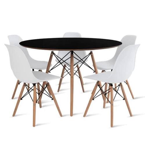 Conjunto de Mesa de Jantar Eames Eiffel Redonda 110cm Tampo de Madeira Preto com 5 Cadeiras Brancas