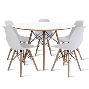 Conjunto de Mesa de Jantar Eames Eiffel Redonda 120cm Tampo de Madeira Branco com 5 Cadeiras Brancas