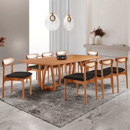Para completar o conjunto, a Cadeira Monaco Premium oferece conforto e sofisticação. Seu encosto foi projetado para proporcionar melhor ergonomia, enquanto o assento estofado garante mais comodidade durante as refeições e encontros com família e amigos. O acabamento cuidadoso e os materiais de qualidade reforçam o estilo elegante do conjunto. Medida da Mesa (A x L x P): 240x110x80cm Peso da Mesa: 87,4 kg Mesa suporta até: 40 kg Acabamento da Cadeira/Banco: Pintura UV Acabamento da Mesa: Pintura UV Almofada do assento: Fixa Ambiente Principal: Sala de Jantar Cadeira/Banco Estofada: Somente Assento Estofado Cadeira/Banco estofada: Somente Assento Estofado Cadeira/Banco suporta até: 140 kg Cadeira/Banco Suporta Até: 140.0000 codigo_ean: 7900288352071 Complexidade da Montagem: Média: pode ser montado por mais de uma pessoa e/ou necessite de maior conhecimento para montagem Configuração do Conjunto: Mesa com Cadeiras Cor: Linho Preto / Imbuia Natural / Cinamomo Imbuia Cor da Base: Natural Cor das Cadeiras: Marrom Cor do Produto: Linho Preto / Imbuia Natural / Cinamomo Imbuia Cor do Tampo: Natural Cor Flex: Não Cor Secundária: Marrom De Canto (Canto Alemão): Não Escala de Brilho: Semi-Brilho Espessura do Tampo: 40 mm Estrutura do Assento: Madeira Maciça Formato do Tampo: Retangular Informações Complementares: As cadeiras são entregues totalmente montadas e prontas para uso, enquanto a mesa chega pré-montada, facilitando a instalação e garantindo praticidade. Itens Inclusos: 1 Mesa, 8 Cadeiras e Kit Ferragens Linha ou Coleção: Ello Monaco Manual de Montagem e Instalação: https://product-hub-prd.madeiramadeira.com.br/615112472/documents/5e3a89ab-9ea3-4785-8551-63753b627dfa343575658441773056258677.pdf Marca: Mobilare Material da Base da Mesa: MDF Laminado/Madeira Maciça Material da Estrutura da Cadeira: Madeira Maciça Material do Tampo: Laminado Material Principal: Madeira Maciça/MDF Material Principal das Cadeiras/Bancos: Madeira Maciça Medida da Cadeira/Banco (A x L x P): 86x48x53cm Medida do Tampo (L x C x E): 240x110x4cm Mesa Dobrável: Não Mesa Extensível: Não Montagem Flex: Não Necessita Montagem: Sim Origem do Produto: Nacional Peso da Cadeira/Banco: 5,7 kg Possui Apoio para Braços: Não Possui Apoio Para os Pés: Não Possui Prateleiras: Não Possui Vidro: Não Quantidade de Cadeiras: 8 Quantidade de Lugares: 08 Recomendações de Uso, Manutenção e Limpeza: Limpar com pano seco. Sistema de Montagem: Parafusos Tipo de Assento: Fixo Tipo de Encosto: Fixo