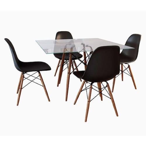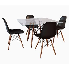 Conjunto De Mesa De Jantar Eames Eiffel Quadrada 90cm Tampo De Vidro Com 4 Cadeiras PretasO Jogo de Mesa 4 Cadeiras Eames Eiffel se destaca pelo design moderno e sofisticado. A Cadeira é confeccionada em policarbonato, sua base é em Madeira maciça, o que confere total resistência e conforto, o tampo da mesa é confeccionado em vidro, sua base é em Madeira maciça. O Jogo de Mesa 4 Cadeiras Eames Eiffel da vida ao ambiente além de combinar com todos os tipos e cores de móveis.Tipo: ConjuntoModelo: Eames Eiffel Wood- DimensõesCadeiraCor: PretaAltura: 85 cmLargura: 47 cmProfundidade: 50 cmAssento x Chão: 45 cmContém: 04 cadeirasPeso máximo suportado: 120 KgMesaCor: VidroAltura: 76 cmLargura: 90 cmProfundidade: 90 cmObs: Imagens Meramente IlustrativaConjunto de Mesa de Jantar Eames Eiffel Quadrada 90cm Tampo de Vidro com 4 Cadeiras Pretas