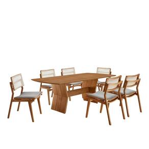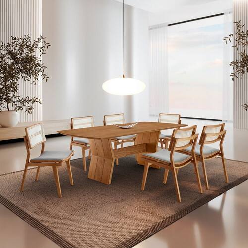 As Cadeiras Eloa Premium são fabricadas em madeira maciça, garantindo durabilidade e imponência. O encosto em rattan natural adiciona um toque artesanal e sofisticado, enquanto os assentos estofados proporcionam máximo conforto, ideais para momentos prolongados à mesa.