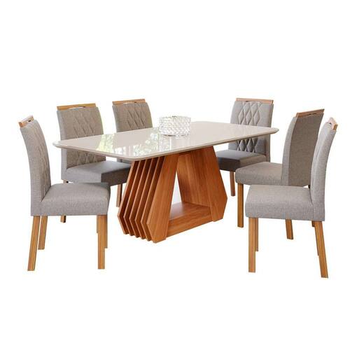 que tal o conjunto de mesa de jantar agata com cadeiras juliana? com o conjunto agata e juliana, sua sala de jantar será o cenário perfeito para momentos memoráveis. composto por uma mesa e 6 cadeiras estofadas em espuma e revestidas em tecido io, este kit proporciona conforto e pde para o seu dia a dia. a mesa, com seu design moderno, tem tampo com aplicação de vidro, adicionando um toque de elegância ao ambiente. por falar nisso, o visual sofisticado das peças é evidenciado pela valorização do tom amadeirado e a coloração neutra, tornando sua casa ainda mais encantadora e bonita. com esse conjunto, temos certeza que você e sua família irão partilhar ótimos momentos juntos ;) Marca: Modern