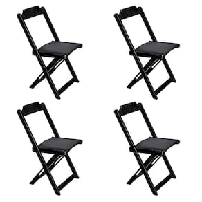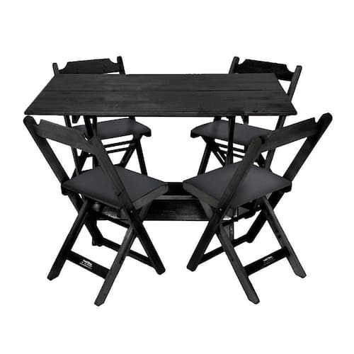 Conjunto De Mesa Dobravel De Madeira 120x70 Com 4 Cadeiras Preto Estofado PretoTenha um pacote completo de praticidade e conforto com este conjunto, ideal para restaurantes, bares, estabelecimentos comerciais, áreas de lazer ou até mesmo para sua casa. Feito em madeira maciça, resistente e durável. Seu design permite que seja encaixado em vários ambientes trazendo um toque estético a mais ao mesmo. Além de estética, este conjunto de mesas e cadeiras também garante praticidade de locomoção dos produtos, longa durabilidade e estofamento confortável.ATENçãO: EVITE USAR PRODUTOS ABRASIVOS E QUíMICOS PARA LIMPEZA DO PRODUTO, aconselha-se o uso de pano umedecido para melhor conservação; mantenha o produto fora de chuva e sol constantes.Matéria prima:Madeira Maciça, de alta densidade e resistente.Sua variação de tonalidades é uma característica típica desta madeira, podendo apresentar diversos tons num mesmo produto em harmonia com o brilho do verniz.Modelo: DobrávelCor: Preto c/ Preto Dimensões (Mesa): Altura 90cm / Largura 120cm / Profundidade 70cm Dimensões (Cadeiras): Altura 88cm / Largura 43cm / Profundidade 33cmConjunto de Mesa Dobravel de Madeira 120x70 com 4 Cadeiras Preto Estofado Preto