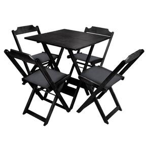 Conjunto De Mesa Dobravel De Madeira 60x60 Com 4 Cadeiras Preto Estofado Preto Tenha um pacote completo de praticidade e conforto com este conjunto, ideal para restaurantes, bares, estabelecimentos comerciais, áreas de lazer ou até mesmo para sua casa. Feito em madeira maciça, resistente e durável. Seu design permite que seja encaixado em vários ambientes trazendo um toque estético a mais ao mesmo. Além de estética, este conjunto de mesas e cadeiras também garante praticidade de locomoção dos produtos, longa durabilidade e estofamento confortável. ATENçãO: EVITE USAR PRODUTOS ABRASIVOS E QUíMICOS PARA LIMPEZA DO PRODUTO, aconselha-se o uso de pano umedecido para melhor conservação; mantenha o produto fora de chuva e sol constantes. Matéria prima: Madeira Maciça, de alta densidade e resistente. Sua variação de tonalidades é uma característica típica desta madeira, podendo apresentar diversos tons num mesmo produto em harmonia com o brilho do verniz. Modelo: Dobrável Cor: Preto c/ Preto Dimensões (Mesa): Altura 90cm / Largura 60cm / Profundidade 60cm Dimensões (Cadeiras): Altura 88cm / Largura 43cm / Profundidade 33cm Marca: MEGA MADEIRA Ean: 7895037834710
