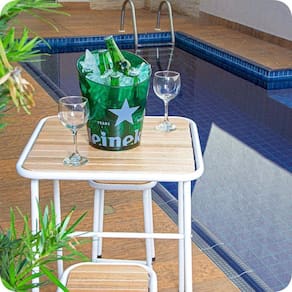 Conteúdo do kit - 1 mesa e 2 bancos Material da estrutura: aço Material do assento: madeira Acabamento: pintura eletrostática epóxi com proteção anti-ferrugem de fosfatização Cor: branca Estrutura da banqueta e mesa: tubo redondo Medida do tubo: 7/8