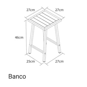 Dimensões da mesa Altura da base até o chão: 75cm Medida da base: 50cm x 50cm Peso aproximado 6,8kg Dimensões da banqueta Altura do assento até o chão: 47cm Medida do assento: 27cm x 27cm Peso aproximado: 2,6kg Fácil montagem, apertar os fixadores do tampão da mesa e assentos da banqueta.