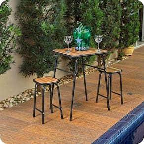 Conteúdo do kit - 1 mesa e 2 bancos Material da estrutura: aço Material do assento: madeira Acabamento: pintura eletrostática epóxi com proteção anti-ferrugem de fosfatização Cor: preto fosco Estrutura da banqueta e mesa: tubo redondo Medida do tubo: 7/8