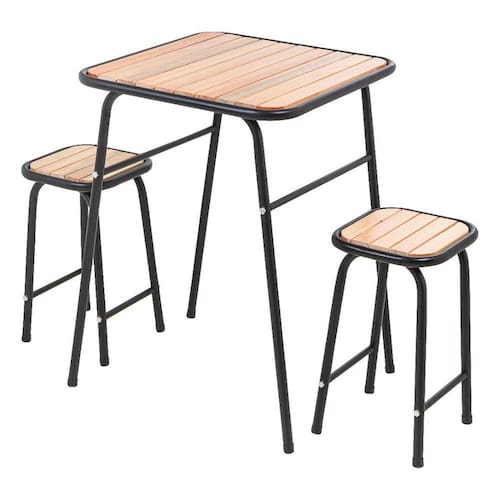 Conjunto De Mesa E 2 Bancos Preto Para Cozinha CompactaÁ cozinha e áreas gourmet costumam ser um dos espaços mais agradáveis de uma casa ou apartamento. É o ambiente onde a família podem se reunir para relaxar e dividir bons momentos. O conjunto de mesa é ideal para esses momentos, além de dar um charme na decoração do seu espaço. Conteúdo do kit: 1 mesa e 2 bancosMaterial da estrutura: açoMaterial do assento: madeiraAcabamento: pintura eletrostática epóxi com proteção anti-ferrugem de fosfatizaçãoCor: preto foscoEstrutura da banqueta e mesa: tubo redondoMedida do tubo: 7/8 Dimensões da mesaAltura da base até o chão: 78cmMedida da base: 55cm x 55cmPeso aproximado 4,2kg Dimensões da banquetaAltura do assento até o chão: 47cmMedida do assento: 27cm x 27cmPeso aproximado 2,2kgFácil montagem, apertar os fixadores do tampão da mesa e assentos da banqueta.