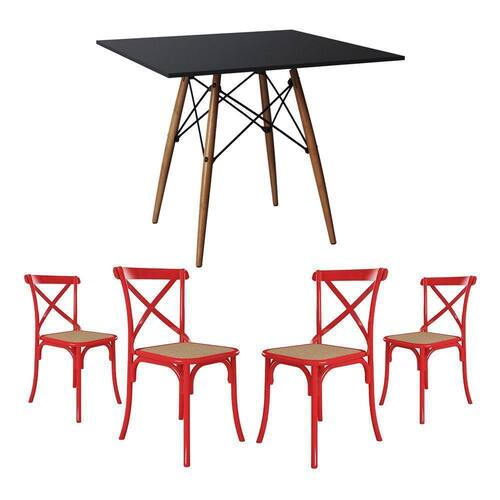 Conjunto De Mesa Eiffel Quadrado Tampo De Madeira 90cm Preto Com 4 Cadeiras Katrina Vermelha Assento