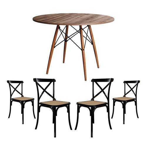 Conjunto De Mesa Eiffel Redondo Tampo De Madeira 90Cm Amêndoa Com 4 Cadeiras Katrina Preto