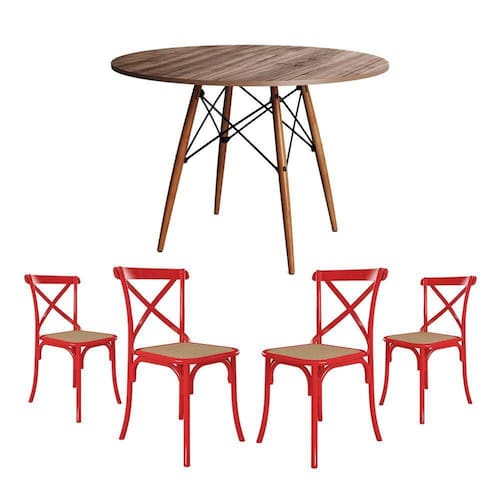 Conjunto De Mesa Eiffel Redondo Tampo De Madeira 90cm Amêndoa Com 4 Cadeiras Katrina Aço Vermelha AssentA sua cozinha ou sala de jantar ficará completa com esse lindo Conjunto de Mesa e Cadeiras! Contendo um design de móveis moderno, elegante e com uma ousada combinação de cores, esse é um kit que certamente é uma solução que esbanja estilo, elegância e muito requinte.O conjunto tem em sua diversificada estrutura de materiais com altíssima qualidade, que proporciona muito mais resistência, mesmo com o passar dos anos, e com seus 4 assentos Katrina Aço é ideal para um jantar em família sem abrir mão do conforto. O Kit acompanha versatilidade e combina com vários tipos de decoração, o que dá mais praticidade em sua casa.Informações técnicas Conjunto:Conteúdo da Embalagem: 01 Mesa e 04 Cadeiras (Embalados Separadamente).Instruções/Cuidados: Limpar com pano seco ou levemente umedecido com água.Necessita de Montagem? Sim.Mesa:Modelo: Eiffel WoodTipo: RedondaCor do tampo: AmêndoaCor da base dos pés: Wood (Madeira)Material do tampo: MadeiraMaterial dos pés: MadeiraDimensões: Altura: 76 cm // Largura: 90 cm // Profundidade: 90 cmCadeiras:Modelo: KatrinaCor: Vermelha e BegeMaterial da estrutura: Aço com Pintura E-PoxMaterial do assento: Espuma D14 com Revestimento em Corano.Dimensões: Altura: 90 cm // Largura: 50 cm // Profundidade: 55 cmConjunto de Mesa Eiffel Redondo Tampo de Madeira 90cm AmÃndoa com 4 Cadeiras Katrina Vermelha Assent
