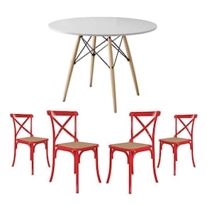 Conjunto De Mesa Eiffel Redondo Tampo De Madeira 90cm Branco Com 4 Cadeiras Katrina Vermelha Assento